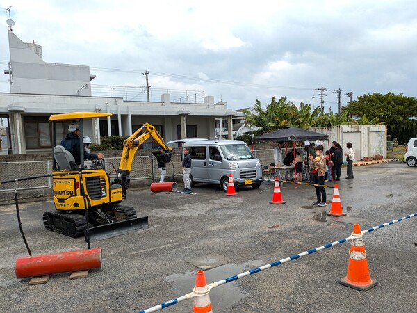 外ではユンボー体験と水道資材で作る水鉄砲体験。ユンボー体験では、運転体験です小さいお子様は社員の上に座って一緒に運転(*^_^*)安全第一 その隣では、水道資材で作る水鉄砲体験です。